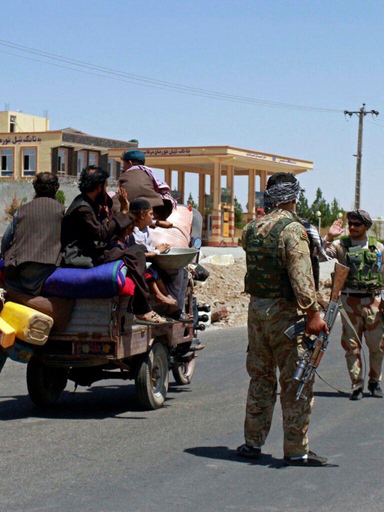 Afghan security personnel patrol after they took back control of parts of Herat city following fighting between Taliban and Afghan security forces as a families leave their house on the outskirts of Herat province, west of Kabul, Afghanistan, Sunday, Aug. 8, 2021. (AP Photo/Hamed Sarfarazi)